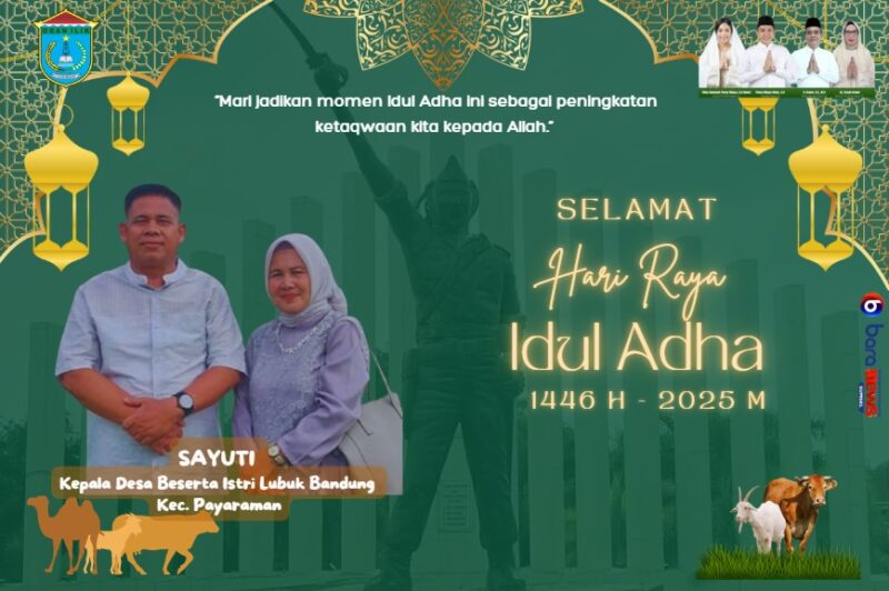 OGAN ILIR – Baranewssumsel.online.com, Segenap Keluarga Besar Pemdes Lubuk Bandung Kecamatan Payaraman Kabupaten Ogan Ilir mengucapkan Selamat Hari Raya Idul Adha 1446 H / 2025 M kepada seluruh umat Islam. Mereka berharap semangat pengorbanan dan keikhlasan yang terkandung dalam perayaan Idul Adha dapat menjadi inspirasi bagi semua orang untuk menjalani kehidupan dengan penuh keimanan dan ketulusan.